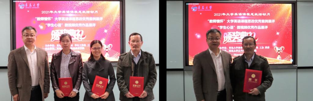 活动现场,获得全国外语课程思政优秀教学案例特等奖的于明杰老师、获得本次“教师情怀”大学英语课程思政优秀案例比赛一等奖的徐淑丽老师进行了经验分享。获得“学生心语”微视频大赛特等奖的学生团队展示了他们的获奖作品,并与指导教师一起讲述了视频背后的故事。