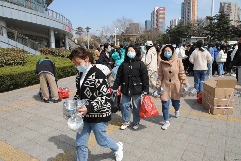 在浮山校区的体育馆南侧餐具发放现场,师范学院一位的大一女生在领到餐盒后高兴地说:“很感谢学校给我们发了餐具,我们以后不需再用一次性餐具吃饭了,既保温又卫生,还很环保。”生命科学学院的一位男生说道:“学校对我们学生生活很关心,我们也一定会响应学校号召,坚决配合学校做好疫情防控工作。”