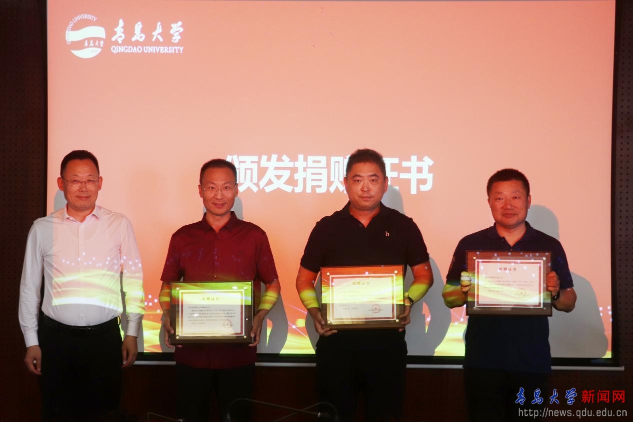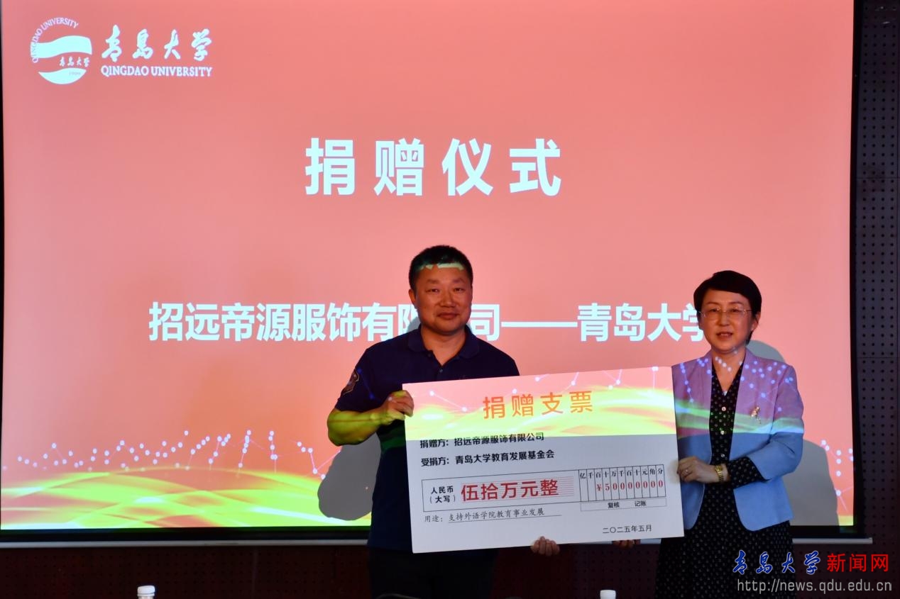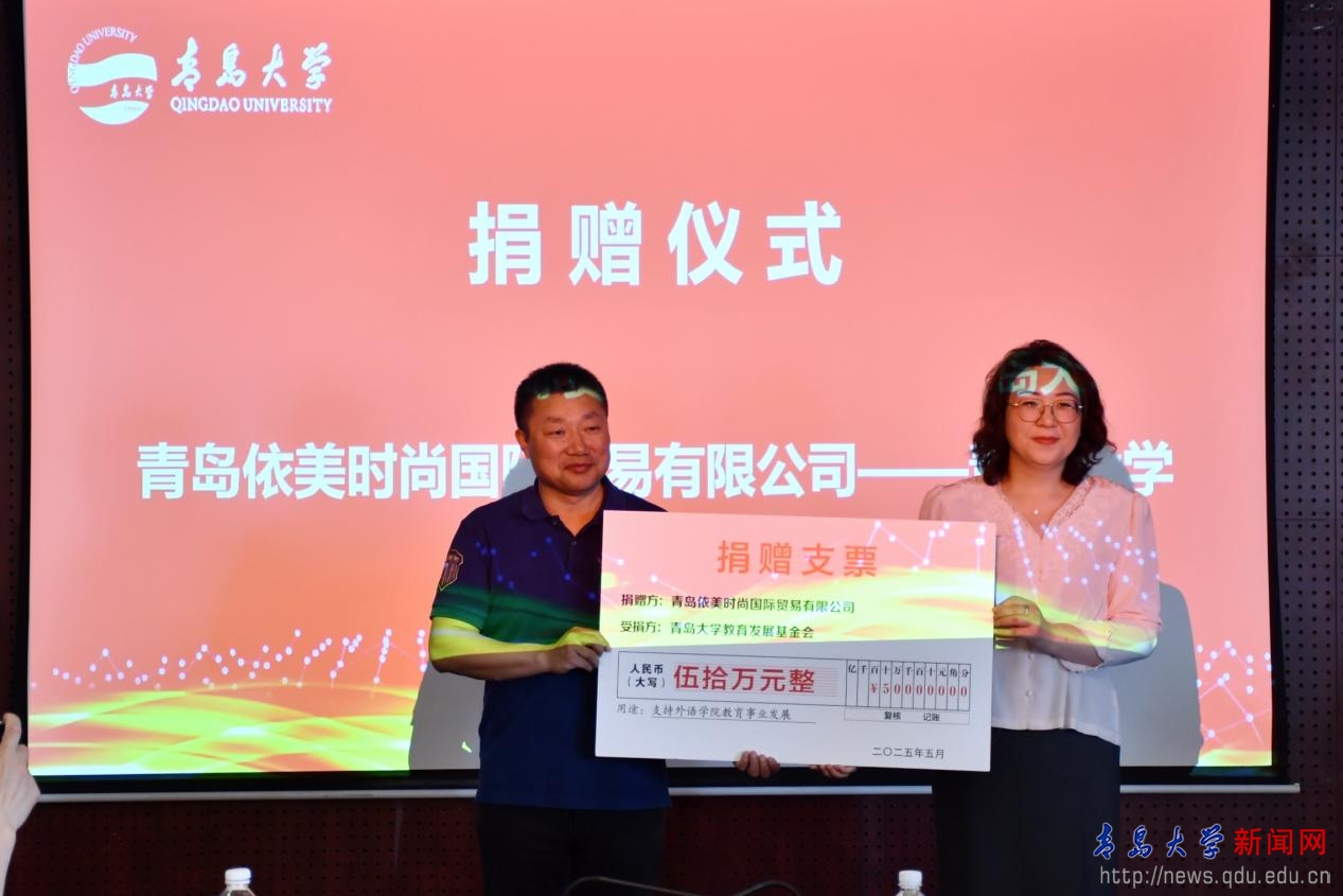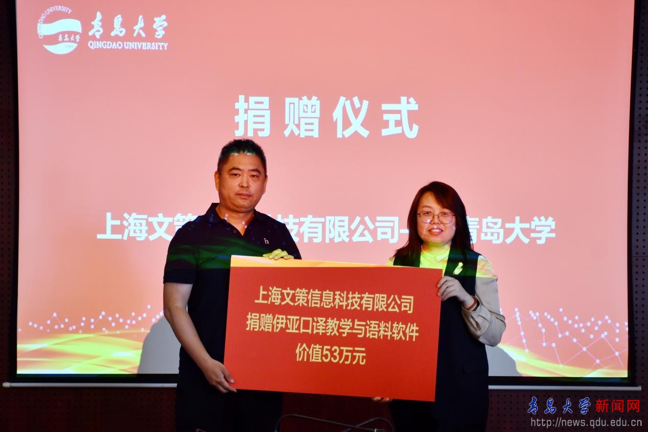 为支持学校和外语学院教育事业发展,四家社会企业此次向学校提供资金捐赠和实物捐赠,合计捐赠金额175.06万元。其中,96级日语系校友刘伟、李永胜分别捐赠50万元,设立“依美时尚教育基金”和“帝源服饰教育基金”,用于支持学院的学科建设、教师发展、人才培养、校园文化建设。青岛智邦慧海文化传播有限公司捐赠价值22.06万元的智慧教室设备,上海文策信息科技有限公司捐赠价值53万元的伊亚口译教学与语料软件V1.0软件系统,用于外语学院计算机辅助翻译实验室的设备更新和系统升级,提升学院计算机辅助翻译教学的信息化、智能化水平,为AI赋能高水平外语语言人才成长提供平台支撑。