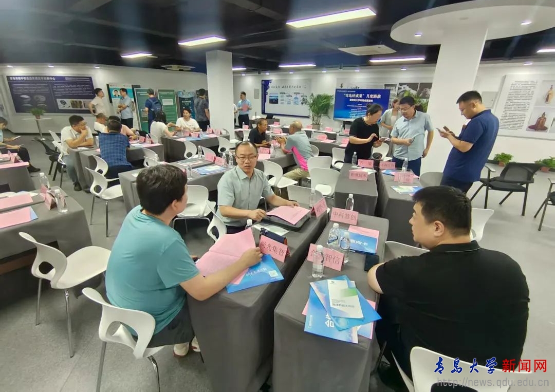本次活动聚焦青岛市“10+1”产业体系发展需求,重点展示了纺织服装学院田明伟教授“健康用智能可穿戴材料和器件”、电气工程学院王春芳教授“单管逆变无线电能传输技术及应用”、青岛医学院王胤副教授“基于大模型的中西医慢病智能诊疗平台”、自动化学院徐冠华博士“智能重载无人直升机研发及产业化”、青岛医学院范长江教授“一种可诱导骨再生以及皮下伤口愈合的微球基植入材料”、计算机科学技术学院万志波副教授“制造行业数字化测量检测系统”、公共卫生学院齐策副教授“人源益生菌和消化道模拟器的研究”、自动化学院刘华波教授“医院停机坪综合管控智慧平台”共8项具有产业化前景的创新成果。活动现场,各项目团队与科技企业代表、技术经纪人围绕成果转化路径、市场应用前景等进行了深入对接交流。青岛远度智能科技有限公司与“智能重载无人直升机研发及产业化”项目、青岛诺森生物技术有限公司与“人源益生菌和消化道模拟器的研究”项目建立初步合作意向。