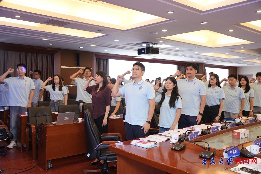 仪式最后,班主任姜彬带领全体新入职辅导员进行入职宣誓。铿锵有力的誓言既表达了他们矢志投身教育事业、恪守育人初心的坚定信念,也展现了全心全意服务学生成长、不负使命担当的郑重承诺。