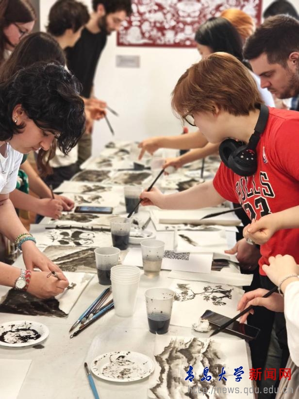 紧接着,活动进入到“中国水墨山水”绘画体验和“中国结”编结体验环节。两项活动同步进行,在孔院教师的细致指导下,参与者们分组体验中国传统艺术的魅力。大家在创作中体会到中国文化的精妙与意境,不时传出阵阵欢声笑语。