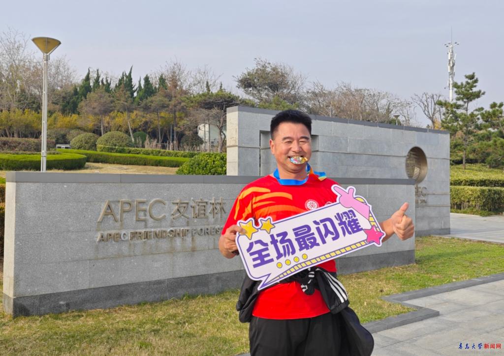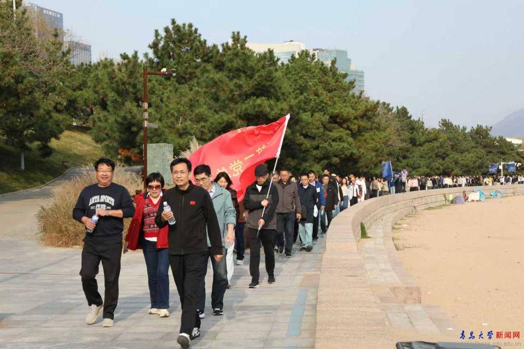 肖江南发令枪响后,领队高举校旗,各分工会旗手高举会旗,队伍按序出发。大家途经雕塑园、海风观景台、极地海洋世界等标志性景点,一路欢声笑语、相互鼓劲。校医院派出医护人员全程随行,为活动保驾护航。14:00,首批队员抵达终点—青岛极地海洋世界广场,工作人员第一时间发放纪念奖牌。在终点,教职工纷纷签名、拍照,留下专属“青大记忆”。