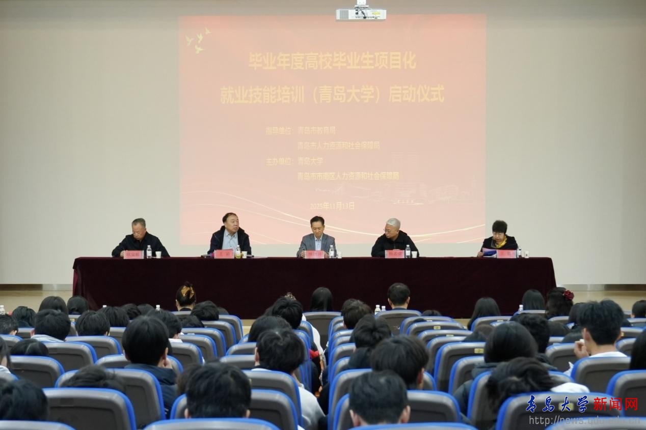 新闻网讯 11月13日,毕业年度高校毕业生项目化就业技能培训在学校金家岭校区图文中心学术报告厅举行启动仪式。校党委常委、副校长麻国升,青岛市人力资源和社会保障局(以下简称市人社局)职业能力建设处处长杨志强,青岛市教育局(以下简称市教育局)高教处二级调研员王涵,青岛市市南区人力资源和社会保障局(以下简称市南区人社局)党组书记、局长王蕾等出席仪式。仪式由继续教育学院院长耿宝福主持。