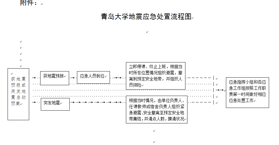 1.2.2 避震疏散工作组:由学生工作处、研究生院、国际交流合作处、安全管理处及各学院(学部)负责。正在上课时,当堂上课教师应承担组织、指挥本班学生避震、疏散的任务。主要职责:(1)进行避震疏散分组;(2)确定疏散次序、疏散路线、疏散场地,组织疏散到安全地带并维护秩序;(3)组织开展师生避震、疏散、简单救护演练;(4)妥善安置受伤师、生,做好灾情调查、统计,并及时向校地震应急工作领导小组汇报。