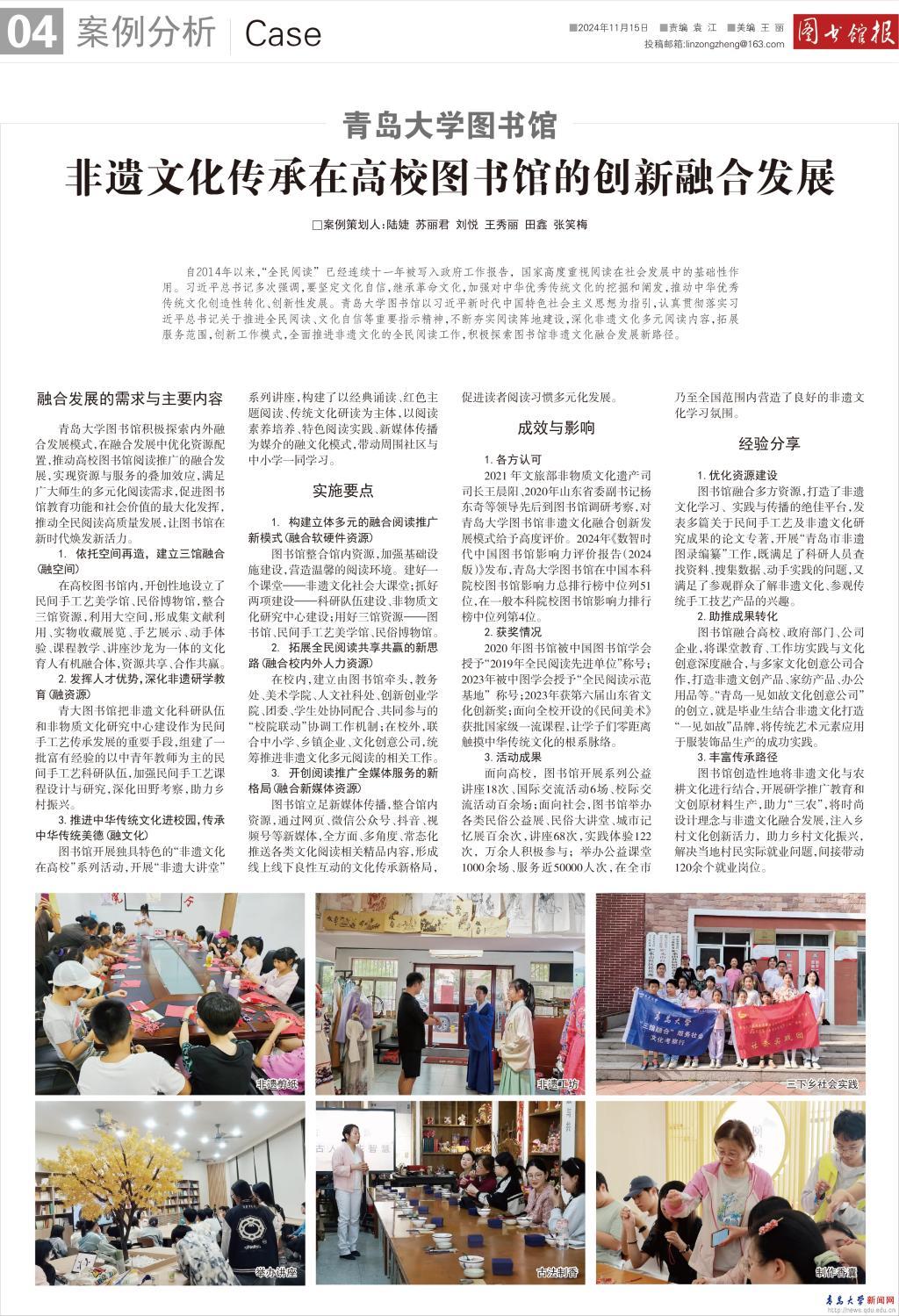 《图书馆报》总第718期第4版整版刊发MILE米乐图书馆题为《非遗文化传承在高校图书馆的创新融合发展》的文化创新案例。案例结合近年来MILE米乐非遗文化空间建设和传承活动开展情况,融整图书馆、民间手工艺美学馆、民俗博物馆三馆资源,实现空间资源的优化利用(融空间);发挥人才优势,深化非遗研学教育(融资源);推进中华传统文化进校园,传承中华传统美德(融文化)。《图书馆报》是我国图书馆学界第一份也是唯一的一份图书馆行业报纸,于2010年1月1日正式独立发行,已在图书馆界积累了相当高的知名度。